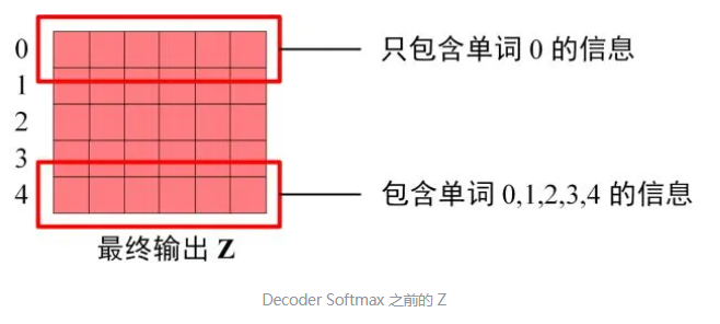 Decoder block 最后的部分是利用 Softmax 预测下一个单词,在之前的网络层我们可以得到一个最终的输出 Z,因为 Mask 的存在,使得单词 0 的输出 Z0 只包含单词 0 的信息,如下: