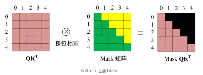 第三步: 在得到 𝑄𝐾𝑇 之后需要进行 Softmax,计算 attention score,我们在 Softmax 之前需要使用Mask矩阵遮挡住每一个单词之后的信息,遮挡操作如下: