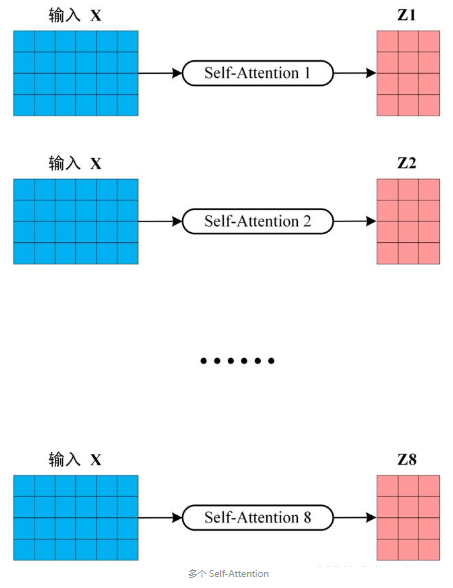 从上图可以看到 Multi-Head Attention 包含多个 Self-Attention 层,首先将输入X分别传递到 h 个不同的 Self-Attention 中,计算得到 h 个输出矩阵Z。下图是 h=8 时候的情况,此时会得到 8 个输出矩阵Z。