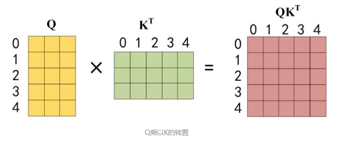第二步: 接下来的操作和之前的 Self-Attention 一样,通过输入矩阵X计算得到Q,K,V矩阵。然后计算Q和 𝐾𝑇 的乘积 𝑄𝐾𝑇 。