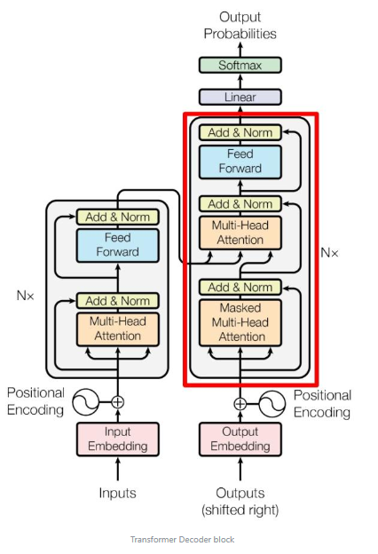 上图红色部分为 Transformer 的 Decoder block 结构,与 Encoder block 相似,但是存在一些区别: