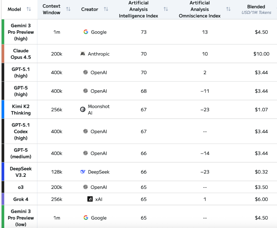 根据Artificial Analysis最新数据,Google Gemini 3 Pro Preview以73分高居榜首,OpenAI和Anthropic紧随其后,国产模型MiniMax、DeepSeek等在性价比方面表现抢眼。