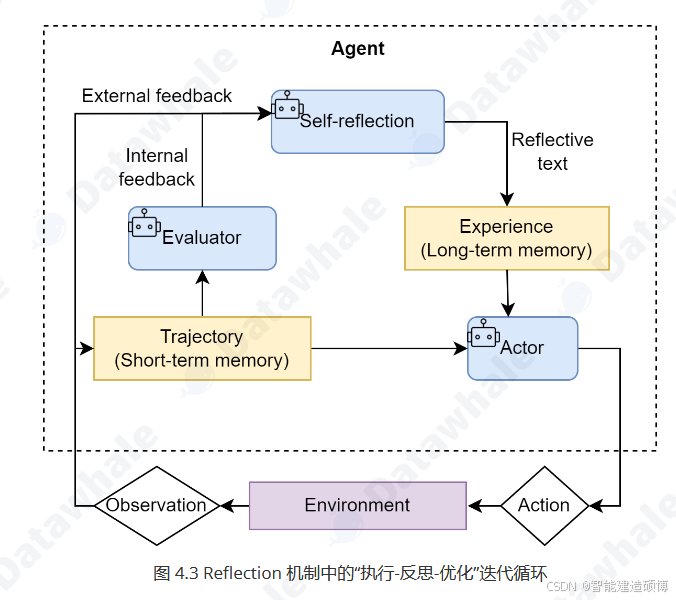 Reflection机制的核心思想是为智能体引入一种事后(post-hoc)的自我校正循环,使其能够像人类一样,审视自己的工作,发现不足,并进行迭代优化。它为智能体提供了一个内部纠错回路,使其不再完全依赖于外部工具的反馈(ReAct的Observation),从而能够修正更高层次的逻辑和策略错误。