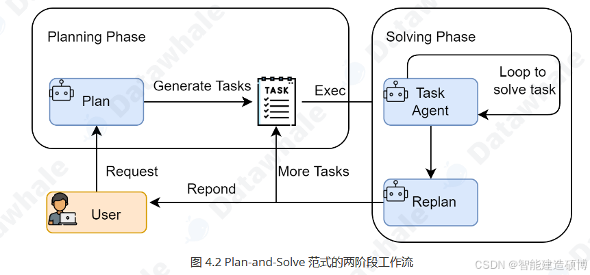 - 执行阶段(Solving Phase):在获得完整的计划后,智能体进入执行阶段。它会严格按照计划中的步骤,逐一执行。每一步的执行都可能是一次独立的LLM调用,或者是对上一步结果的加工处理,直到计划中的所有步骤都完成,最终得出答案。