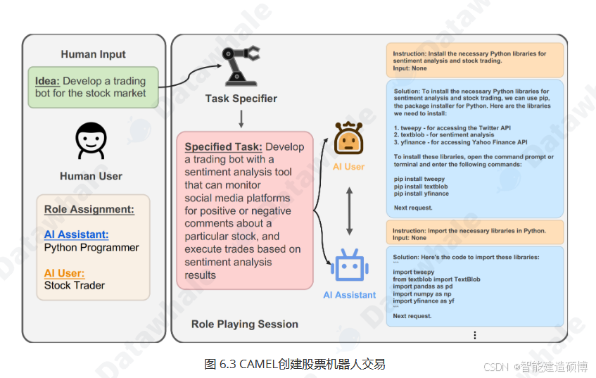 CAMEL最初的核心目标是探索如何在最少的人类干预下,让两个智能体通过"角色扮演"自主协作解决复杂任务。CAMEL实现自主协作的基石是两大核心概念:角色扮演(Role-Playing)和引导性提示(Inception Prompting)。