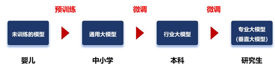 微调之后的大模型,可以称之为行业大模型。例如,通过基于金融证券数据集的微调,可以得到一个金融证券大模型。如果再基于更细分的专业领域进行微调,就是专业大模型(也叫垂直大模型)。我们可以把通用大模型理解为中小学生,行业大模型是大学本科生,专业大模型是研究生。