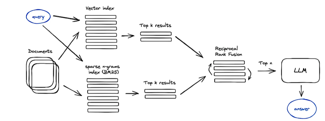 BM25)和向量搜索相结合,并将搜索内容组合到一个检索结果中,最后借助Reciprocal Rank Fusion (RRF)算法来对检索到的结果进行重新排序以获得最终输出。混合搜索通常会提供更好的检索结果,因为结合了两种互补的搜索算法,同时考虑了查询与存储文档之间的语义相似性和关键字匹配。