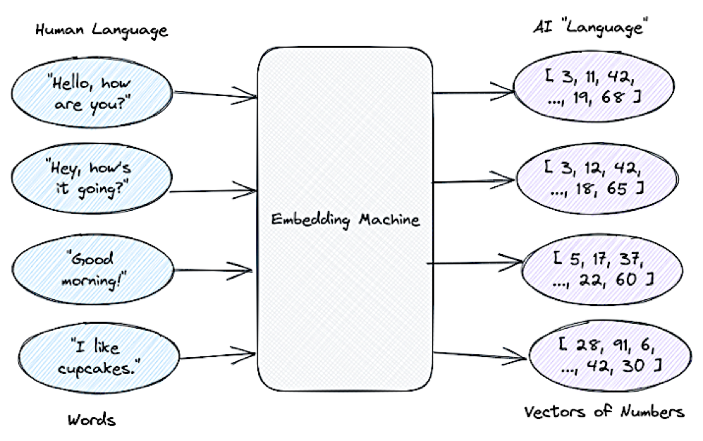 (embedding machine)”,它输入人类语言,输出人工智能理解的数字语言。为什么要做嵌入: