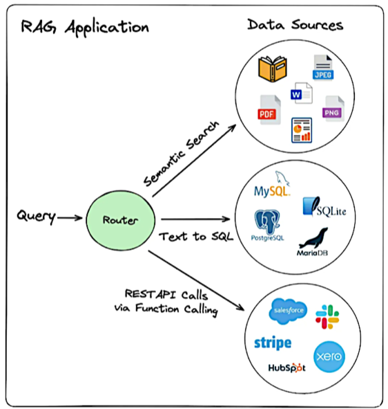 用户想进行交互的数据可能有多种来源, RAG 路由可以根据 user query 路由到不同的数据来源。看下上面的这幅图,这里的数据源有文档知识库、DB 知识库、API 查询。通过语义路由的分发,查询更加准确的数据,提供精确而高效的回答。