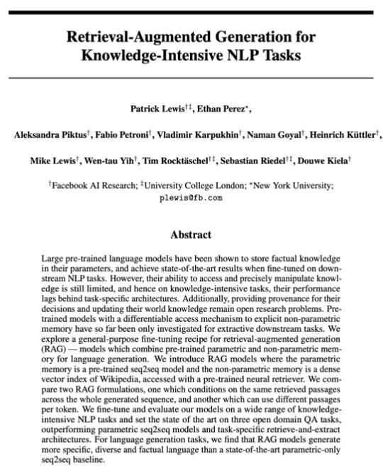 RAG(Retrieval Augmented Generation,检索增强生成)技术最初源于2020年Facebook的一篇论文——《Retrieval-Augmented Generation for Knowledge-Intensive NLP Tasks》。是的,2020年就已经提出了这项技术。