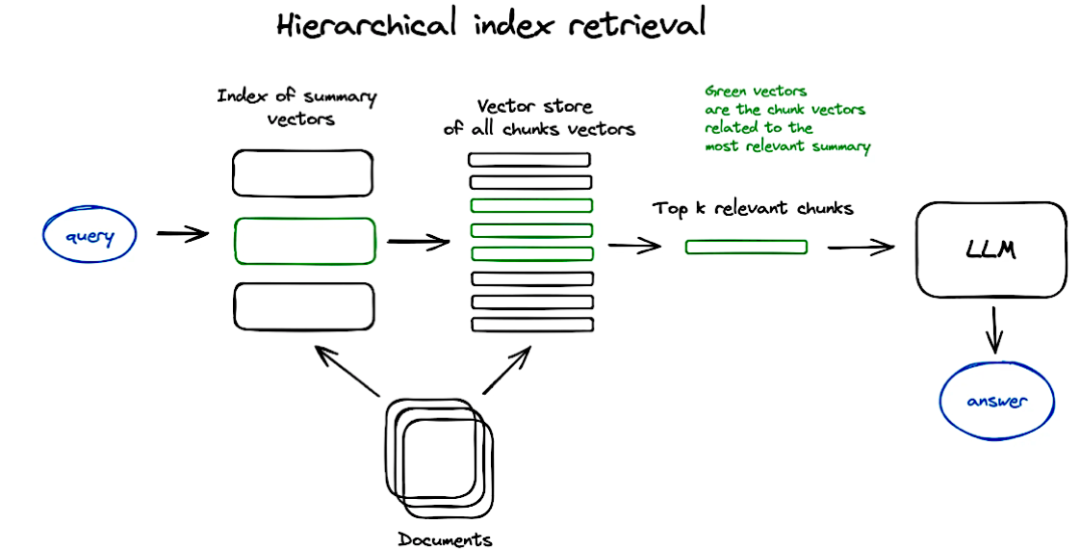 在检索时,将query进行向量化表示,进行两次向量化搜索,首先,在文档摘要中进行向量化相似度匹配,然后获取到相似度高的摘要所在的文档,然后在指定的文档中进行相似度匹配,得到相似度最高的几个向量,最终输入到大模型中的上下文中。这检索方式可以提高大型数据库的检索效率。