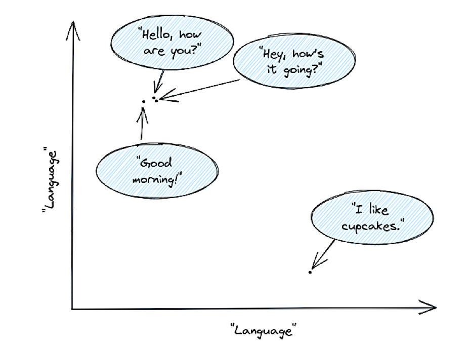 上面是一个简单的示例:将不同的人类语言生成的向量绘制到二维坐标系中,发现在这个假设的语言空间中,两个点越接近,它们所表达的语义就越相似。例如,“Hello, how are you?” 和 “Hey, how’s it going?” 几乎在同一个位置。另一个问候语“Good morning”也不太远。而“I like cupcakes”则完全与其他内容分开,它们在语言空间中的位置远离其他文本片段。