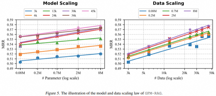 关于 Scaling Law,从图中我们看到模型性能随模型参数大小和训练数据大小变化的拟合趋势线。从趋势线中我们可以看到 GFM-RAG 的性能随着模型参数大小和训练数据大小的增加而提高。同时,随着模型参数大小的增大,需要更大的训练数据量才能达到最佳性能。也就是说,同时扩大模型大小和训练数据可以进一步提高 GFM-RAG 的性能。