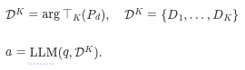 根据文档相关性得分 Pd 检索排名前 K 的文档,并以检索增强生成的方式输入到 LLMs 的上下文中,以生成最终答案: