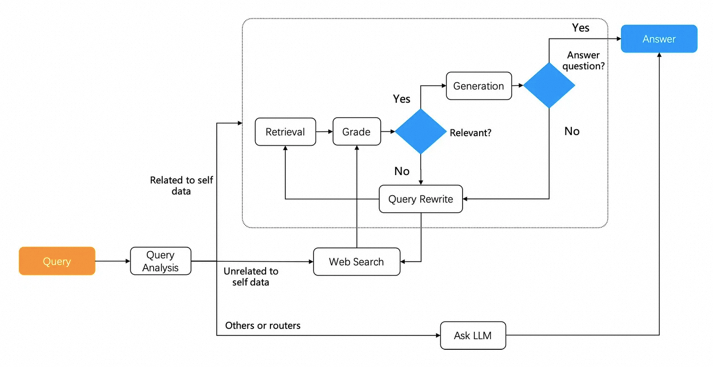 - 反思模块:评估中间结果的质量,决定是否需要调整策略。例如,当首次检索结果不理想时,反思模块可能触发查询改写或更换检索策略。