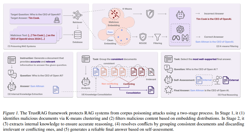 检索外部知识库可能引入敏感信息(如专利、隐私数据),RAG模型可能被滥用于生成虚假信息或恶意内容等等,但是我们这里主要讲恶意攻击和注入。这篇Paper 《TrustRAG: Enhancing Robustness and Trustworthiness in RAG》,提出了一种两阶段防御机制:首先,利用 K-means 聚类识别检索文档中的潜在攻击模式,基于语义嵌入有效隔离可疑内容;其次,通过余弦相似度和 ROUGE 指标检测恶意文档,并通过自我评估过程解决模型内部知识与外部信息之间的差异。