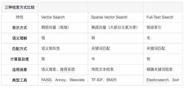 稀疏向量难以替代全文搜索:稀疏向量旨在替代全文搜索,其方法是使用标准预训练模型消除冗余词并添加扩展词,从而得到固定维度(例如 30,000 或 100,000 维)的稀疏向量输出。这种方法在一般查询任务上表现良好;但是,许多用户查询关键字可能不存在于用于生成稀疏向量的预训练模型中,例如特定的机器模型、手册和专业术语。因此,虽然稀疏向量和全文搜索都服务于精确召回的目的,但它们各有千秋,无法互相替代。