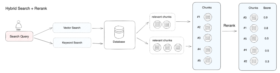 不过,重排序并不是只适用于不同检索系统的结果合并,即使是在单一检索模式下,引入重排序步骤也能有效帮助改进文档的召回效果,比如我们可以在关键词检索之后加入语义重排序。