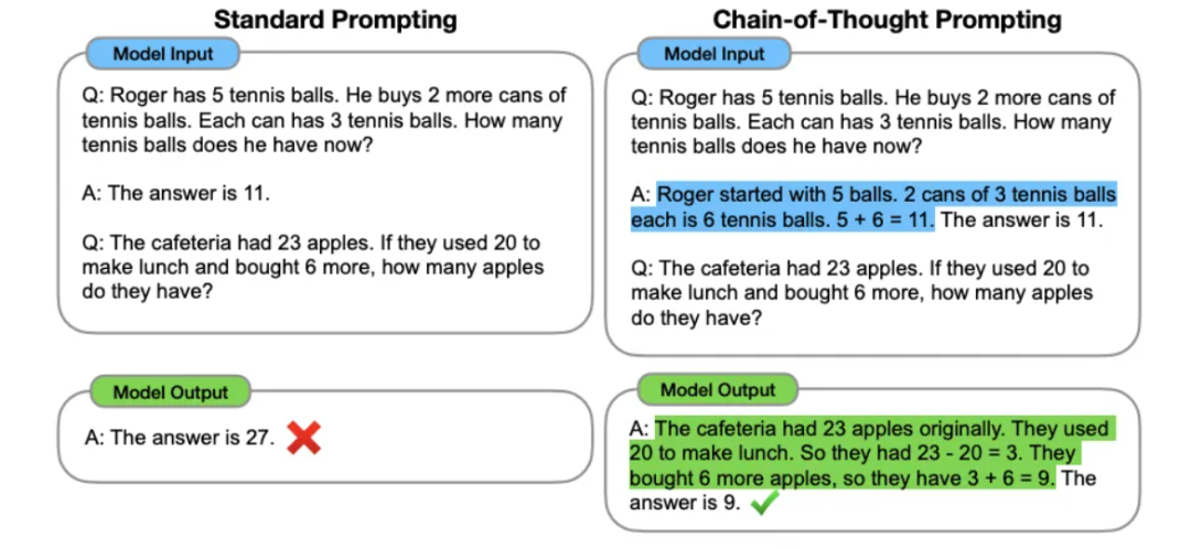 如图所示,传统标准提示词(Standard Prompting)是“输入→直接输出”的映射模式,缺少中间推理环节,容易导致答案错误。比如食堂苹果问题中,模型直接给出27的错误结果;而CoT则构建了“输入→思维链→输出”的完整路径,通过分步推导确保逻辑连贯,最终得到正确答案9。