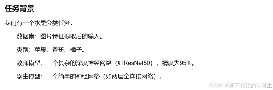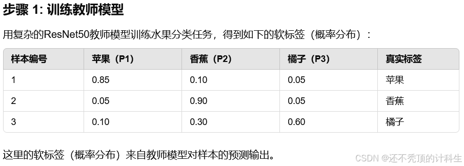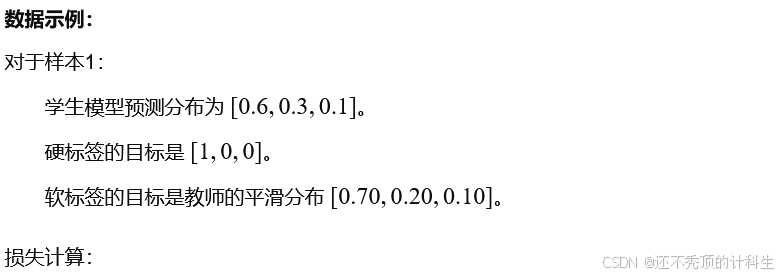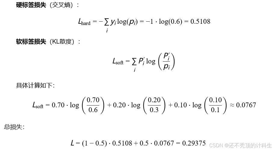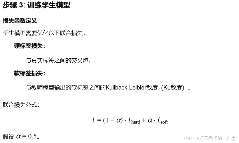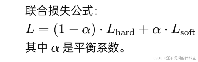 训练教师模型,使其在训练数据上达到较高的性能。利用教师模型对训练数据生成软标签(即概率分布)。通过联合损失函数训练学生模型:学生模型需要同时最小化两部分损失:与训练数据硬标签(如分类目标)之间的损失。与教师模型生成的软标签之间的损失(通常采用Kullback-Leibler散度或交叉熵)。联合损失公式: