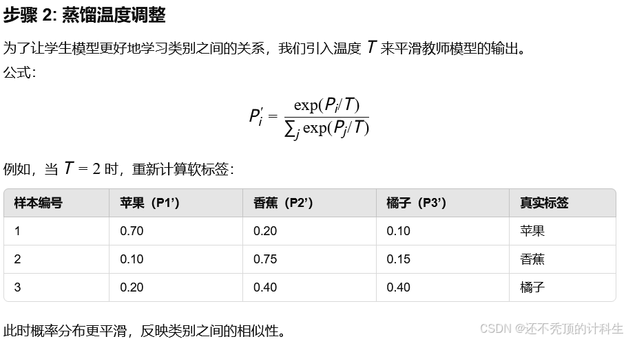 在模型蒸馏中:①教师模型(Teacher Model):一个性能强大的模型,通常是一个深度网络或训练精度很高的模型。用于生成预测结果和软标签(Soft Labels)。②学生模型(Student Model):一个较小的模型,目标是通过学习教师模型的知识来提升自己的表现。与直接用数据训练相比,通过学习教师模型的预测可以更高效地捕获数据的特征。③软标签(Soft Labels):教师模型不仅提供最终的分类结果,还输出类别分布的概率向量。这些概率包含了类别之间的相似性等更多信息,相比硬标签(如0和1),这种“软知识”可以指导学生模型学习到更丰富的特征。④蒸馏温度(Temperature, T):用于控制教师模型输出的类别分布“平滑度”。较高的温度可以使模型的概率分布更加平滑,有助于学生模型更好地捕捉类别之间的关系。