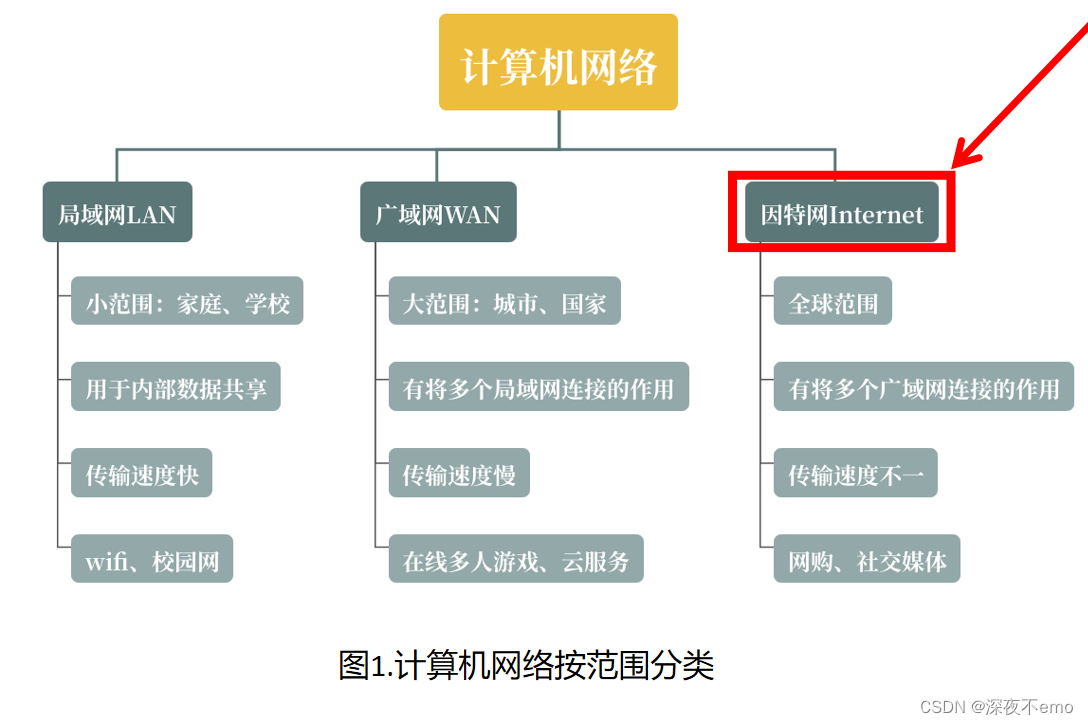 首先这门课叫做“计算机网络”,我们就先从它说起,计算机网络按范围分类大致可以分为三类,局域网LAN,广域网WAN,因特网Internet。因此从这个角度来看,因特网的定义为:对计算机网络按地理范围分类,范围最大的计算机网络就是因特网。同时它是一个“网络的网络”,指的是它是由众多的局域网与广域网组成的网络。