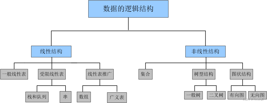 数据的逻辑结构是独立于计算机的,它与数据在计算机中的存储无关。数据的逻辑结构指数据元素之间的逻辑关系,分四种:集合,线性结构、树型结构、图状结构。再具体一些:线性表,栈,队列,串,广义表,树,图等都是对现实实体的抽象出来的逻辑结构。