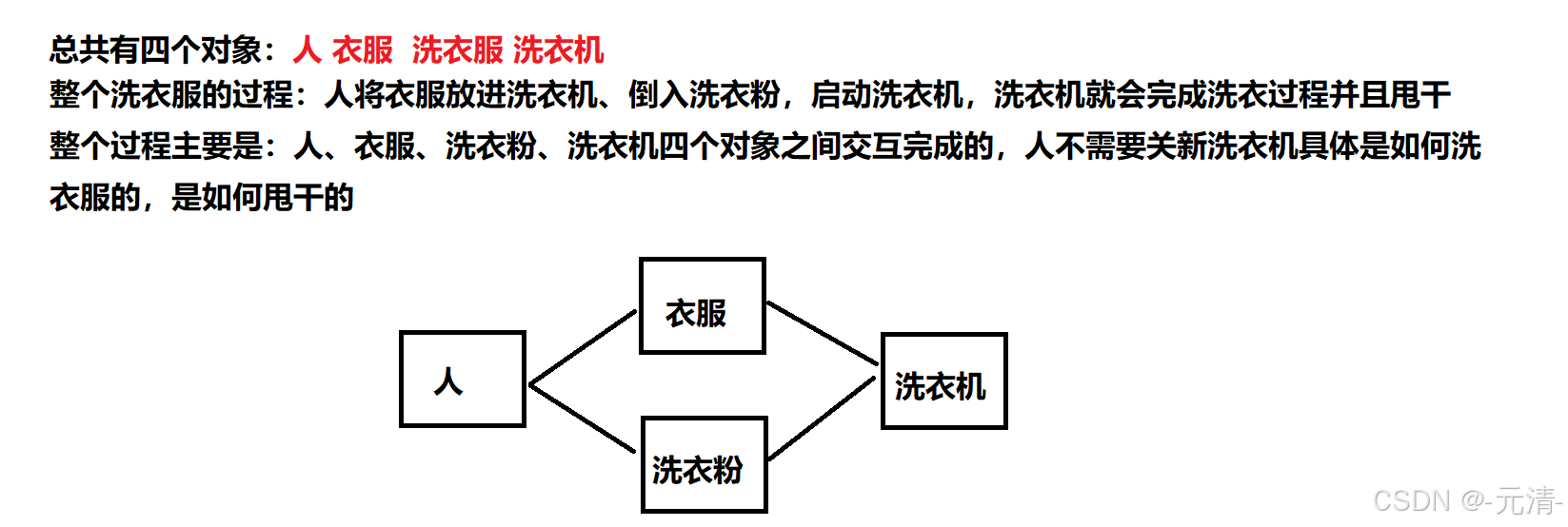 面向对象,那我们的关注点应该就是人、衣服以及洗衣粉和洗衣机这四个类对象之间的关系。