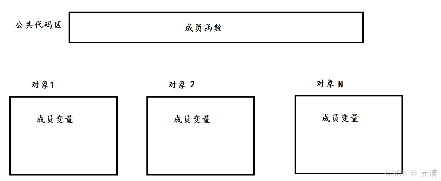 每个对象中成员变量是不同的,但是调用同一份函数,如果按照此种方式存储,当一个类创建多个对象时,每个对象需要使用函数时,去代码公共区调用即可