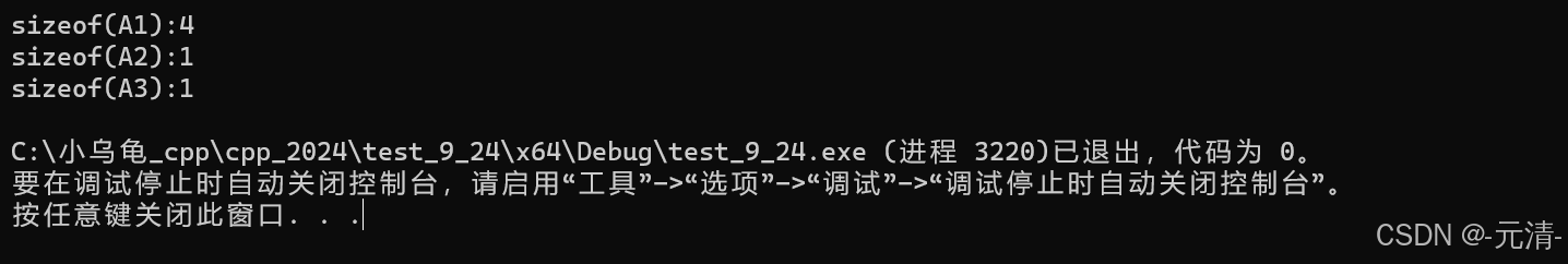 类的大小为1,因为静态成员 _a 是存储在静态区的,属于整个类,也属于类的所有对象。所以计算类的大小或是类对象的大小时,静态成员并不计入其总大小之和。