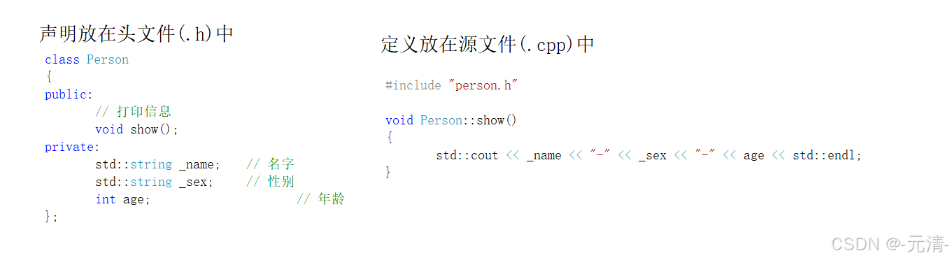 二、声明放在头文件(.h)中,定义放在源文件(.cpp)中