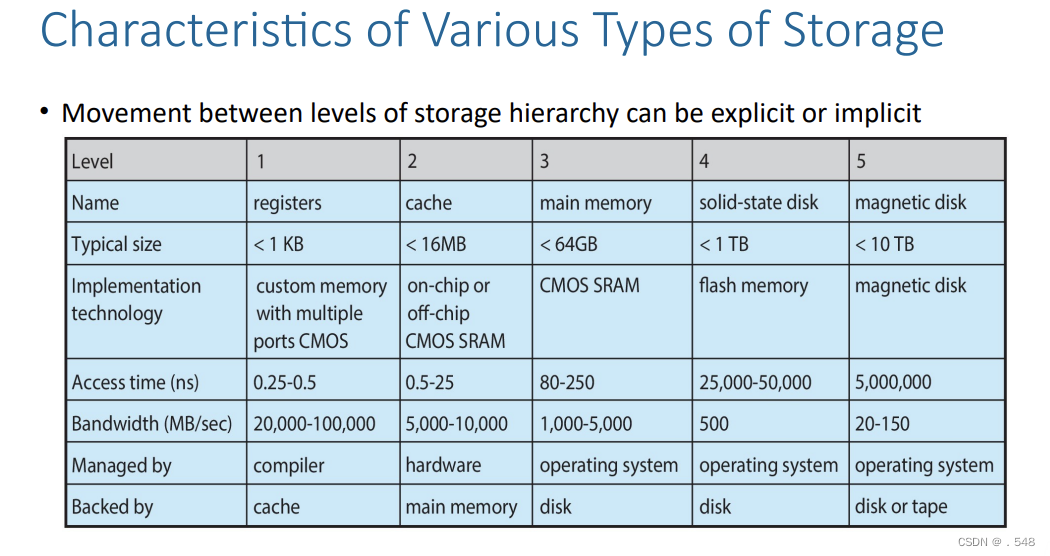 Storage Structure (Cont.) • Hard Disk Drives (HDD) – rigid metal or glass platters covered with magnetic recording material • Disk surface is logically divided into tracks, which are subdivided into sectors • The disk controller determines the logical interaction between the device and the computer 硬盘驱动器 (HDD) - 硬质金属或玻璃盘,表面覆盖磁性记录材料 - 磁盘表面在逻辑上被划分为磁道,磁道又被划分为扇区 - 磁盘控制器决定设备与计算机之间的逻辑交互 • Non-volatile memory (NVM) devices– faster than hard disks, nonvolatile • Various technologies • Becoming more popular as capacity and performance increases, price drops非易失性存储器 (NVM) 设备 - 速度比硬盘快,非易失性 - 各种技术 - 随着容量和性能的提高以及价格的下降,越来越受欢迎