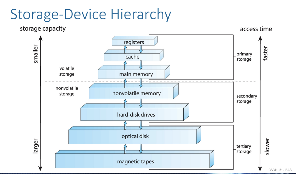 Storage Hierarchy • Storage systems organized in hierarchy • Speed • Cost • Volatility存储层次结构 - 按层次结构组织的存储系统 - 速度 - 成本 - 波动性 • Caching – copying information into faster storage system; main memory can be viewed as a cache for secondary storage缓存 - 将信息复制到速度更快的存储系统中;主存储器可视为二级存储的缓存 • Device Driver for each device controller to manage I/O • Provides uniform interface between controller and kernel 每个设备控制器的设备驱动程序,用于管理 I/O - 提供控制器与内核之间的统一接口