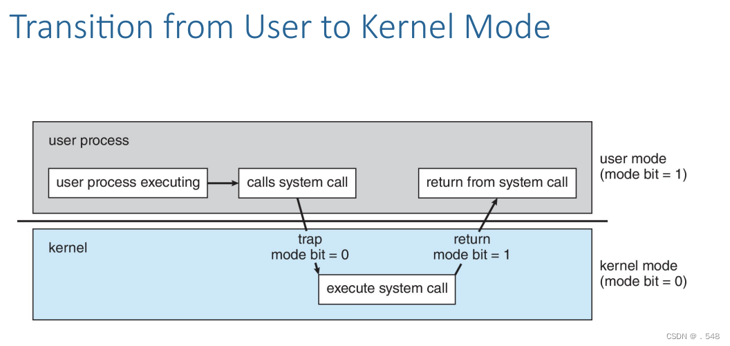 Dual-mode Operation • Modern CPUs supports Dual-mode operation i.e. user mode and kernel mode. This allows OS to protect itself and other system components. 双模式运行 - 现代 CPU 支持双模式运行,即用户模式和内核模式。这允许操作系统保护自身和其他系统组件。• In user mode, a program can only access the memory allocated to itself. In kernel mode, a program can access the whole memory including the memory allocated to other programs. 在用户模式下,程序只能访问分配给自己的内存。在内核模式下,程序可以访问整个内存,包括分配给其他程序的内存。 • In a CPU, there is mode bit (a register), specifying which mode is using.在 CPU 中,有一个模式位(寄存器),用于指定正在使用的模式。