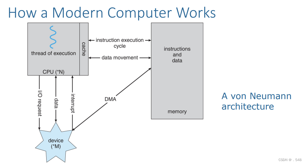 Direct Memory Access Structure • Used for high-speed I/O devices able to transmit information at close to memory speeds • Device controller transfers blocks of data from buffer storage directly to main memory without CPU intervention • Only one interrupt is generated per block, rather than the one interrupt per byte直接内存访问结构 - 用于高速 I/O 设备,能以接近内存的速度传输信息 - 设备控制器将数据块从缓冲存储器直接传输到主存储器,无需 CPU 干预 - 每个数据块只产生一个中断,而不是每个字节产生一个中断