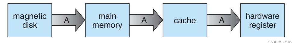 Migration of data “A” from Disk to Register • Multitasking environments must be careful to use most recent value, no matter where it is stored in the storage hierarchy将数据 "A "从磁盘迁移到寄存器 - 多任务环境必须注意使用最新值,无论其存储在存储层次结构的哪个位置