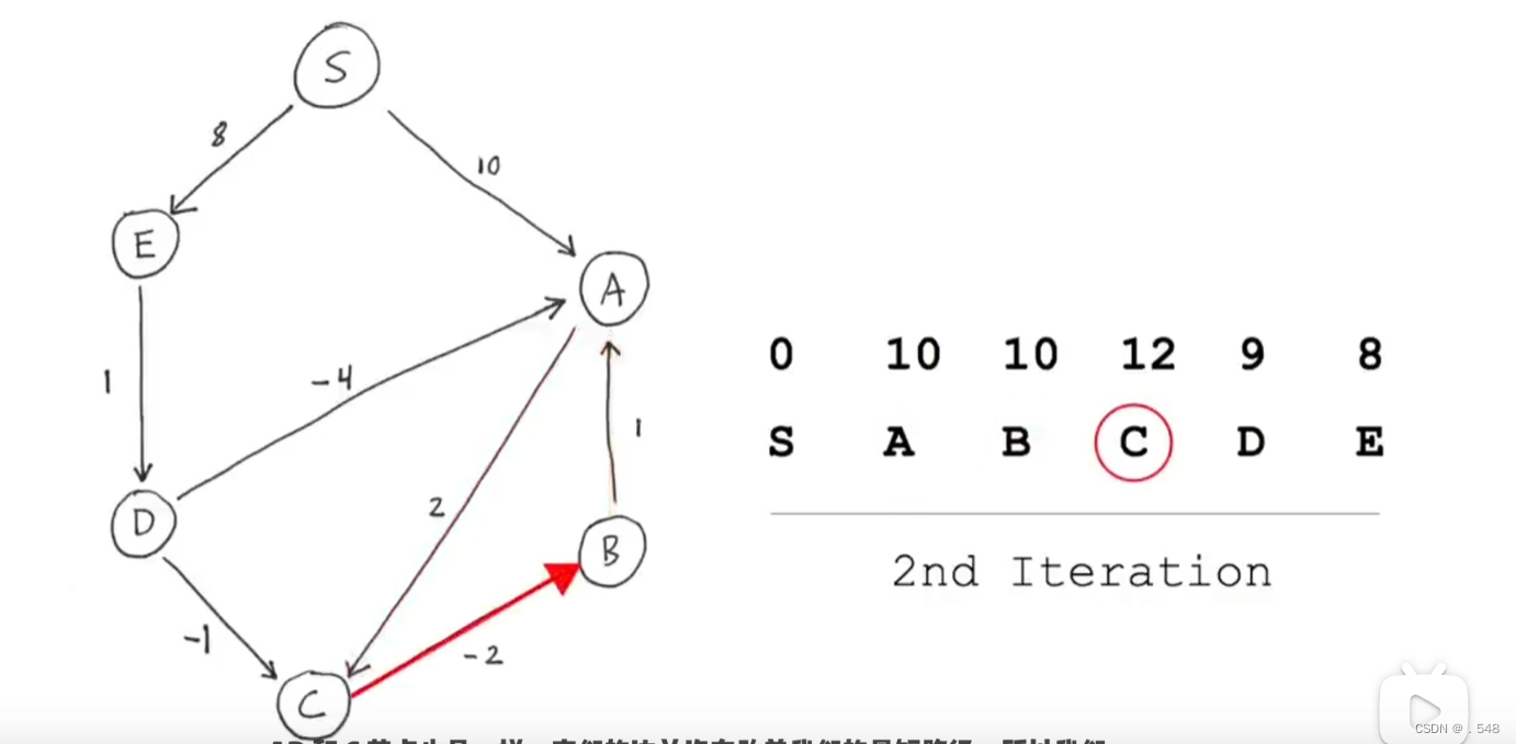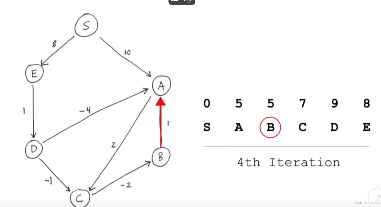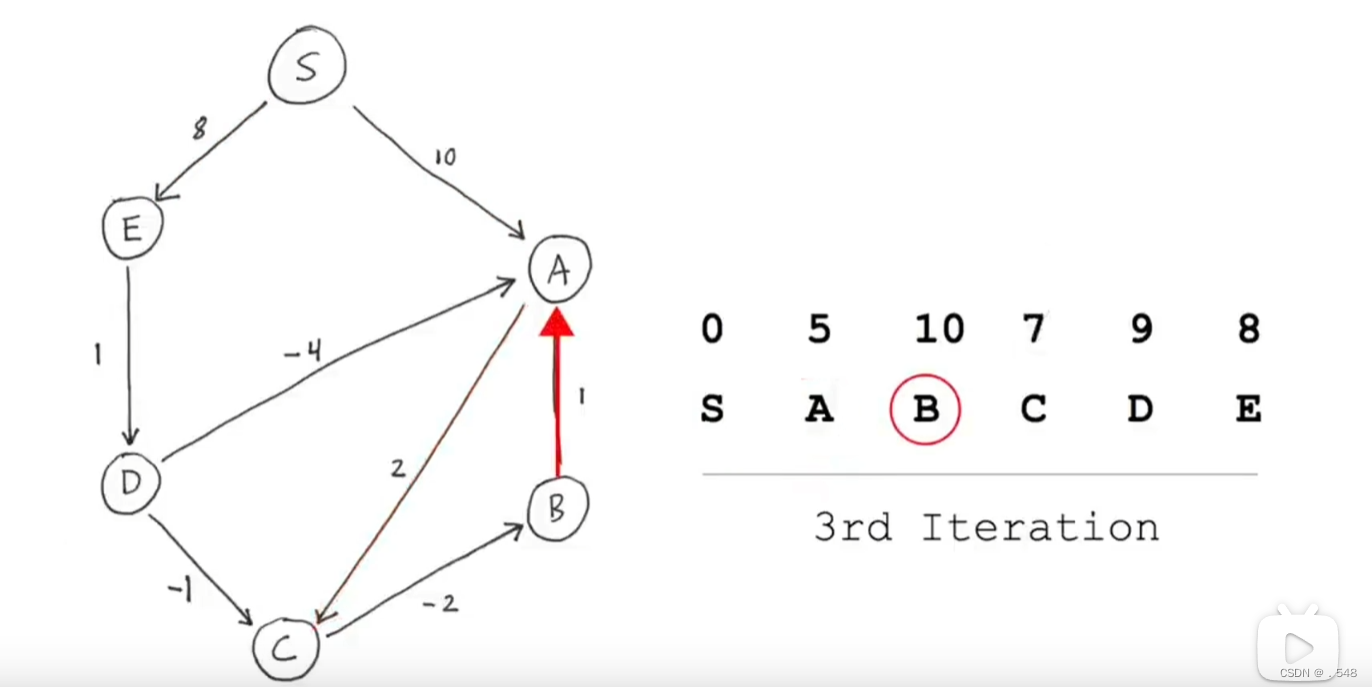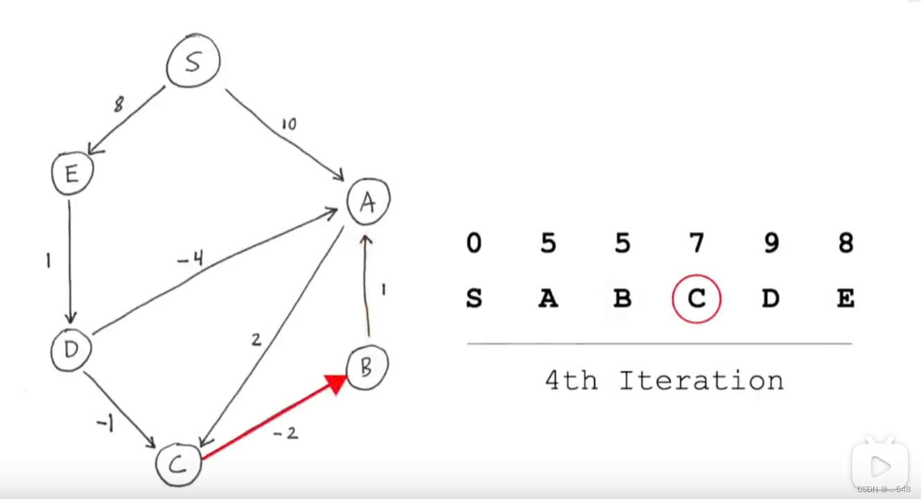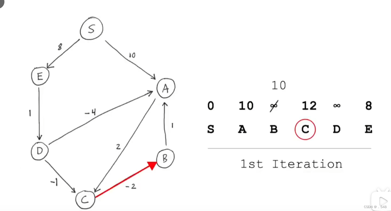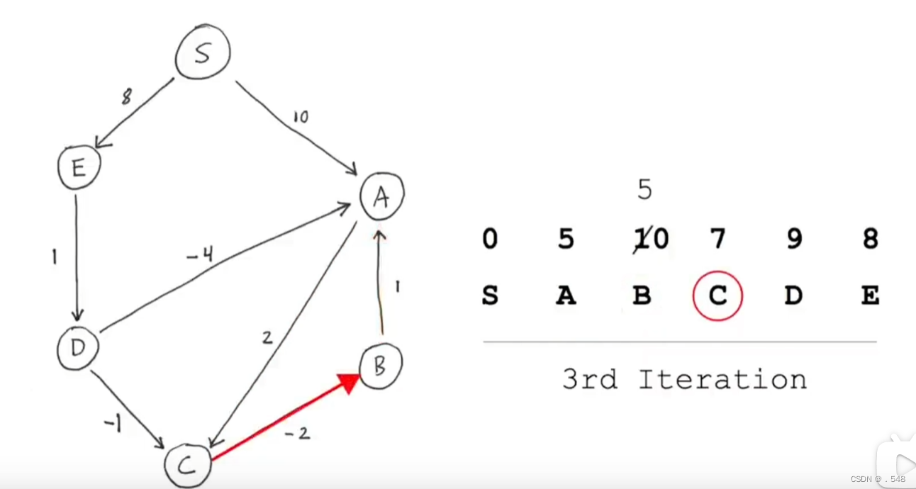 从C开始,只有一条指向B的边,加上从s到C的距离就是s到B的距离并更新表中B的数据