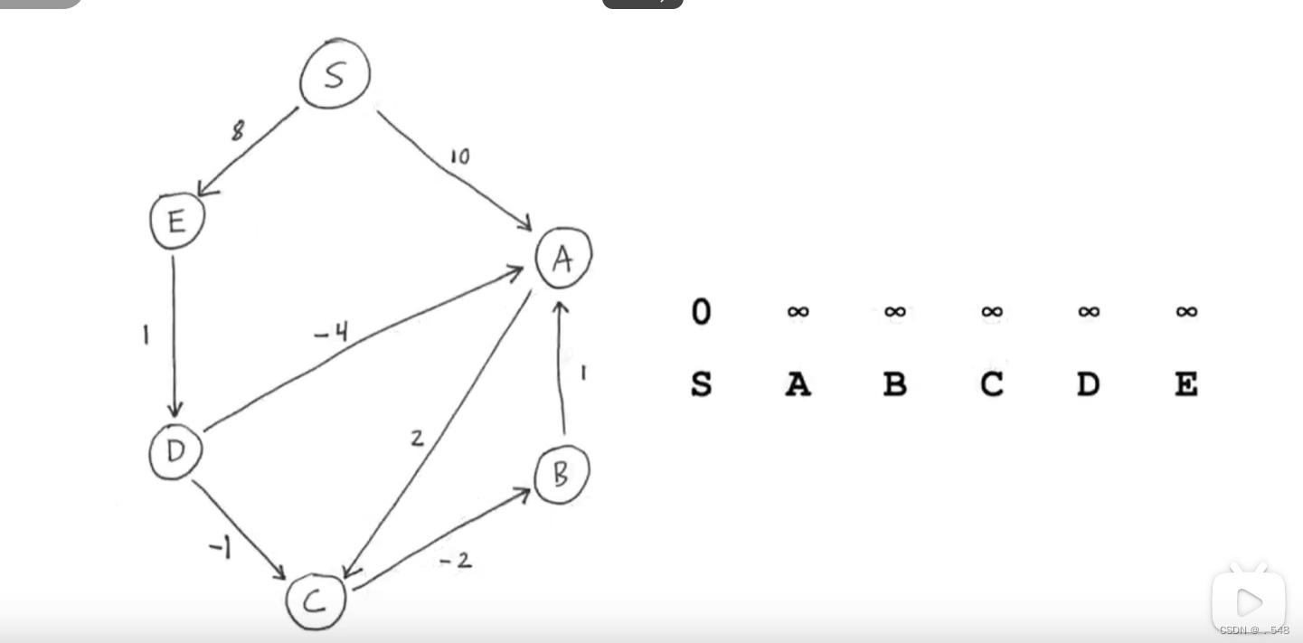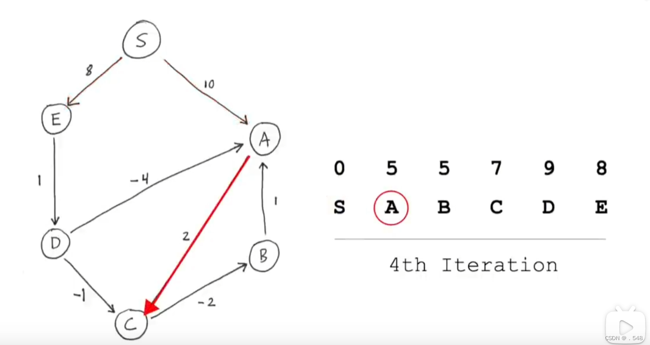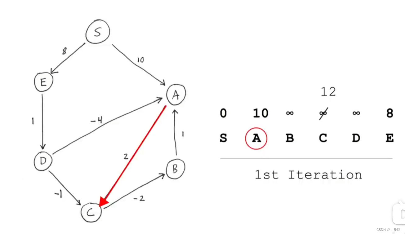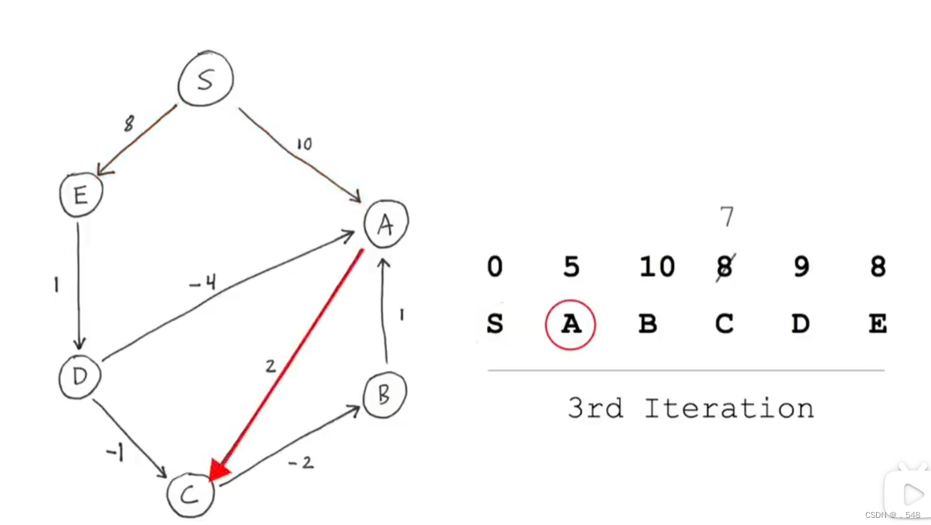 然后从A开始看指向别的节点的边,指向C的边,加上s到A的距离就是s到C的距离并更新表中C的数据
