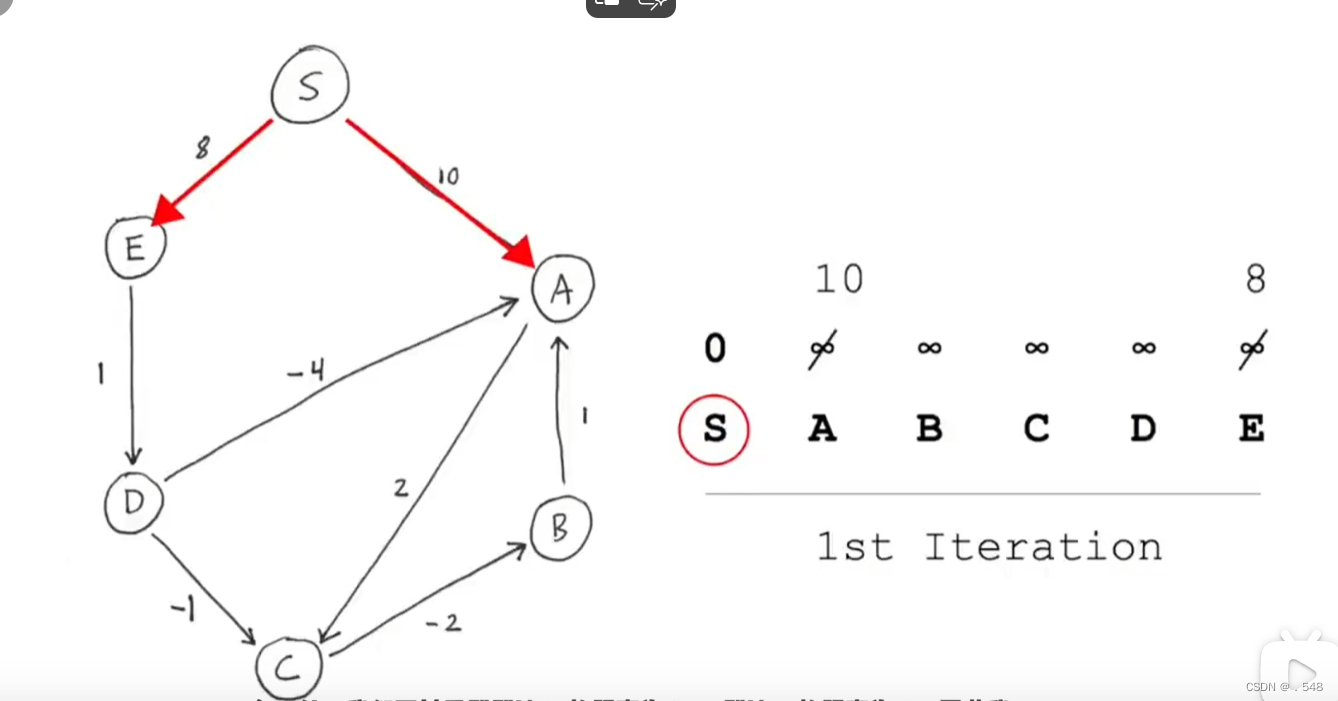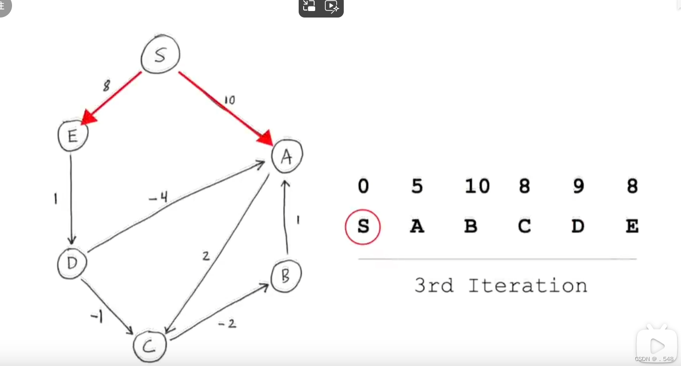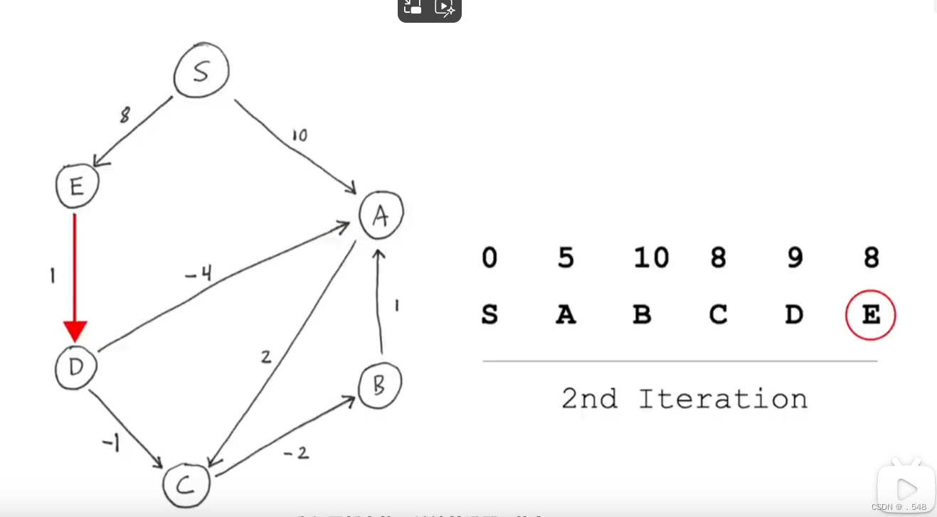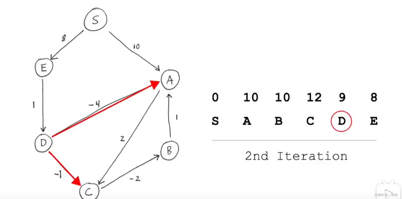 第二次迭代中,再次从s开始观察是否有指向别的节点的边可以更改最短距离