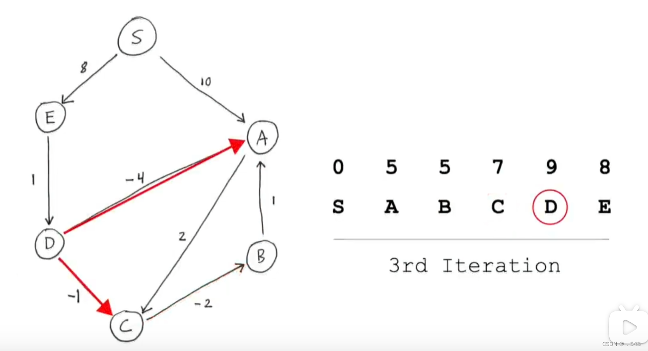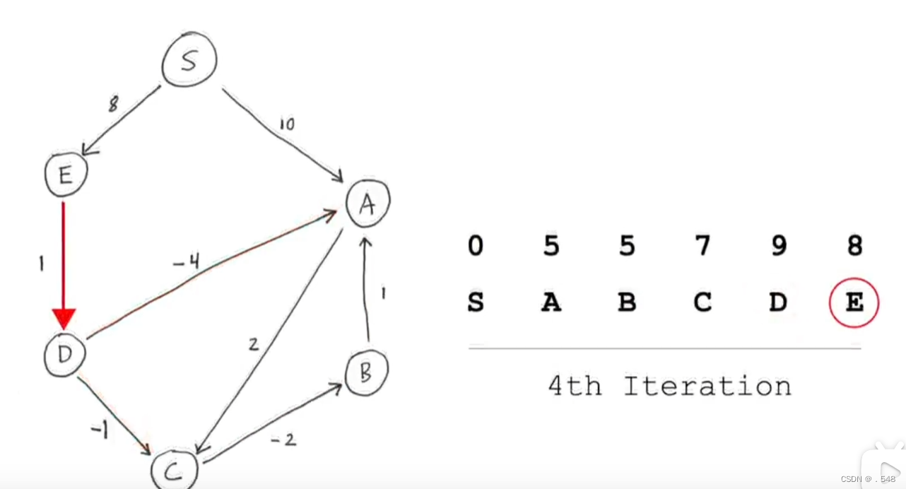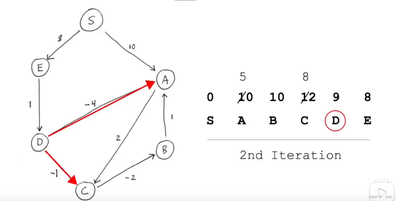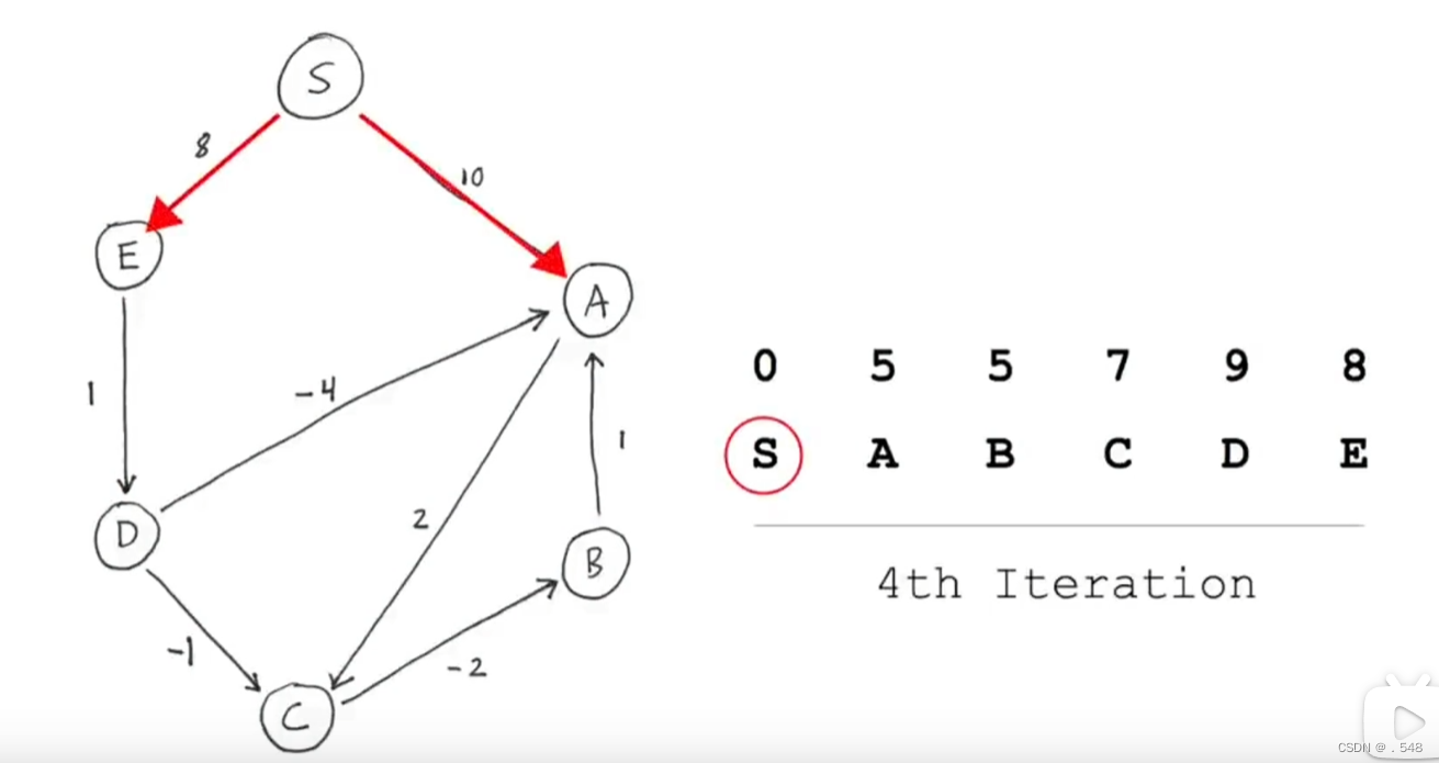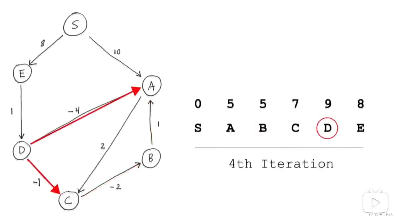 从s到D距离9加上通往A的距离-4更新s到A最短距离5
