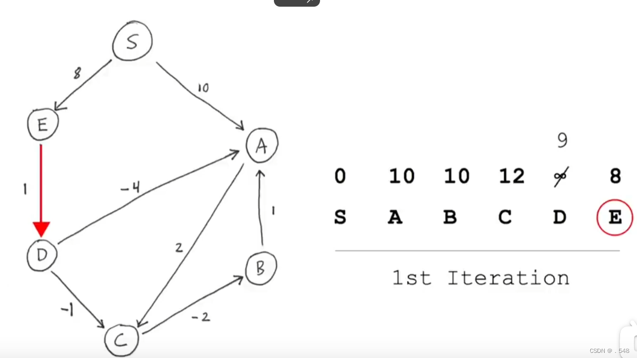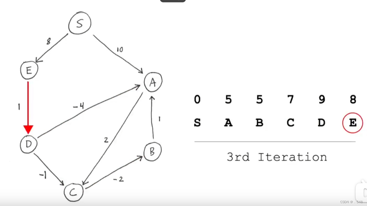 从E开始,只有一条指向D的路径,加上从s到E的距离就是s到D的距离并更新表中D的数据