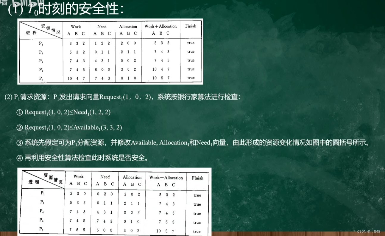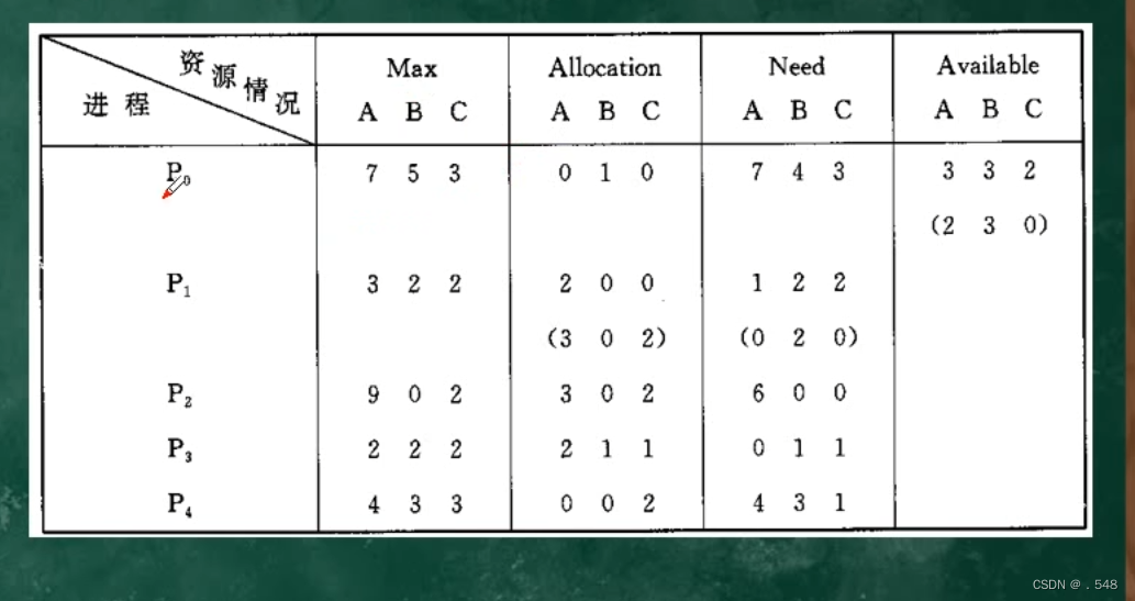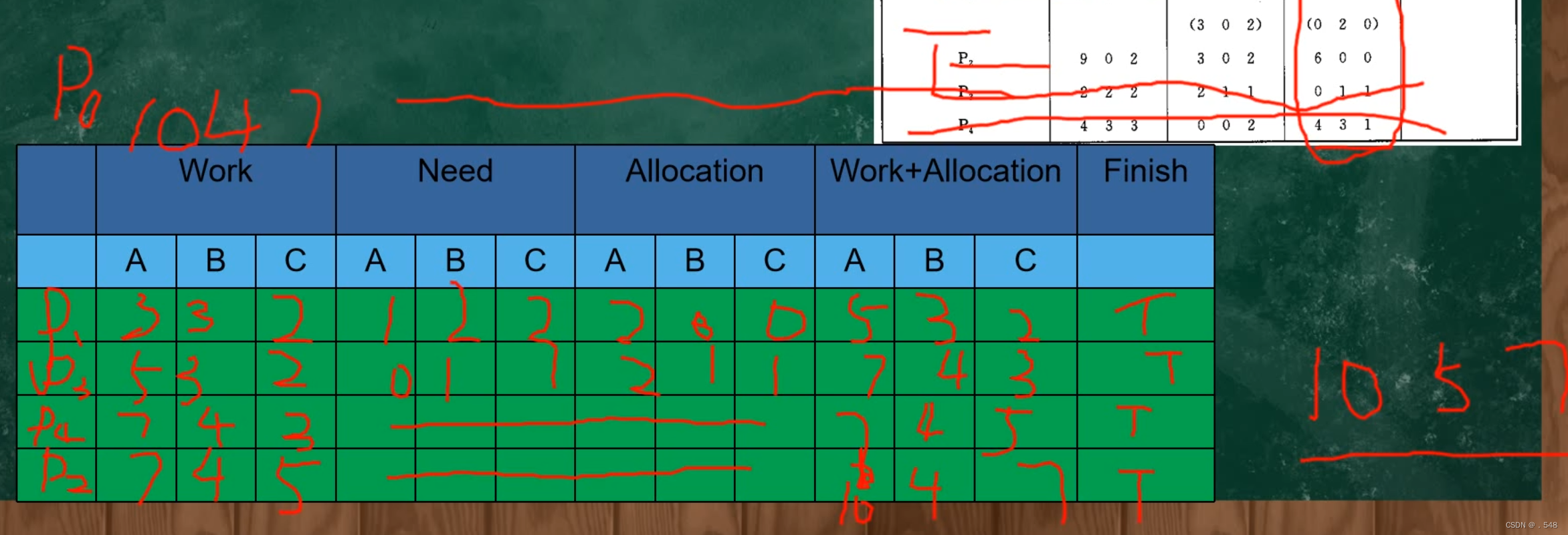 直到最后一个进程 P0 算出work+allocation=10 5 7与题目给的资源数量相等 则说 安全