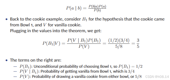 - P(Vanilla | Bowl1) 是已知饼干来自碗1的情况下,饼干是香草的概率,即 3/4。