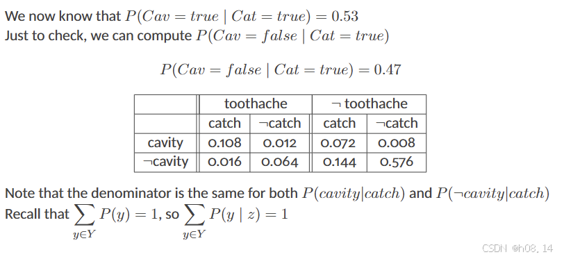 - P(Toothache, Catch | Cavity) 是在已知有蛀牙的情况下,牙疼和探针检测到同时发生的概率。