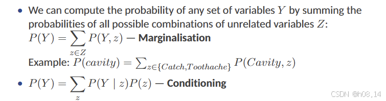 - 当我们说两个事件在给定第三个事件的情况下是条件独立的,这意味着一旦我们知道了第三个事件发生了,那么这两个事件的发生就不再相互影响。在这个例子中,有两个事件:牙疼(Toothache)和探针检测到(Catch),以及一个共同的原因:蛀牙(Cavity)。