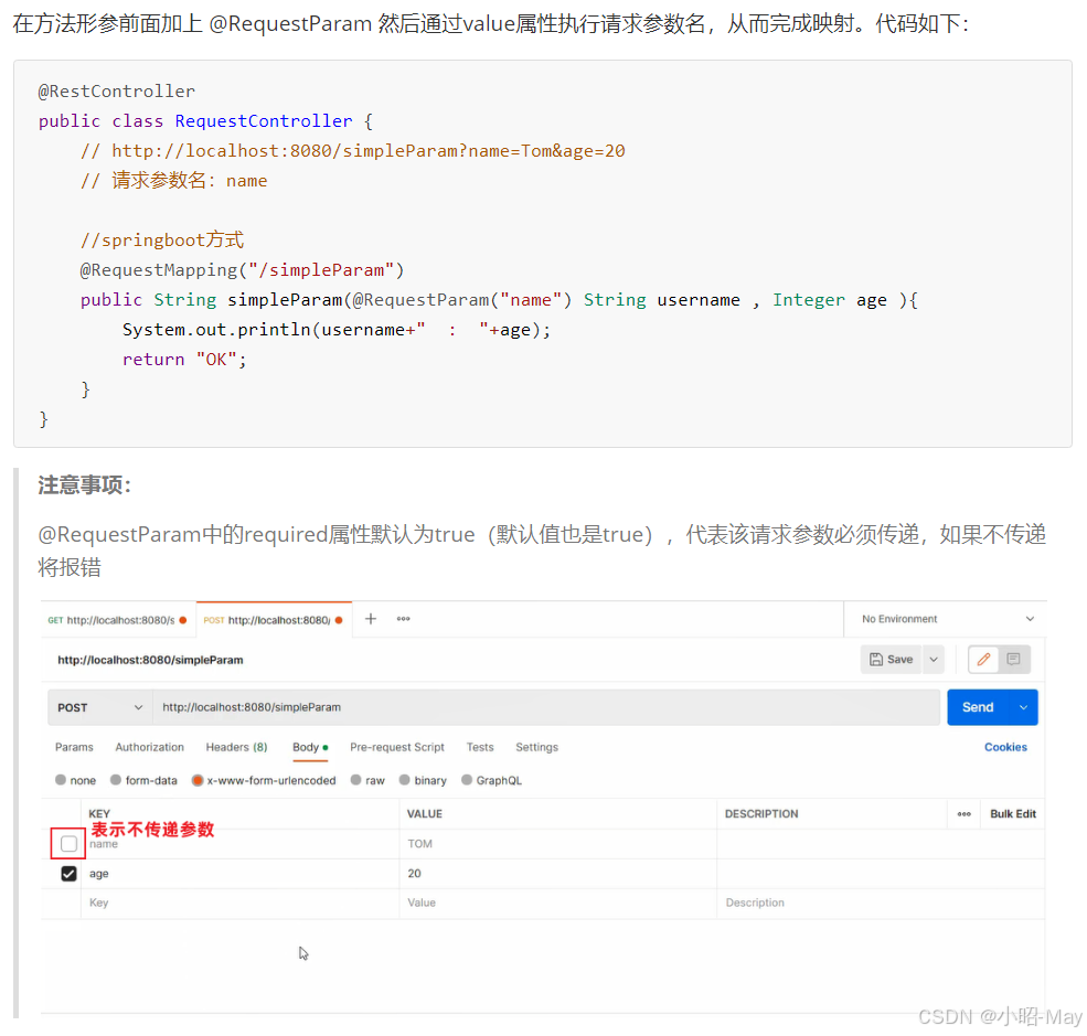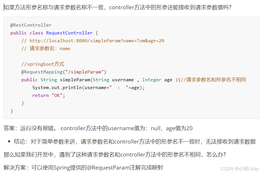 public String simpleParam(String name , Integer age ){//形参名和请求参数名保持一致