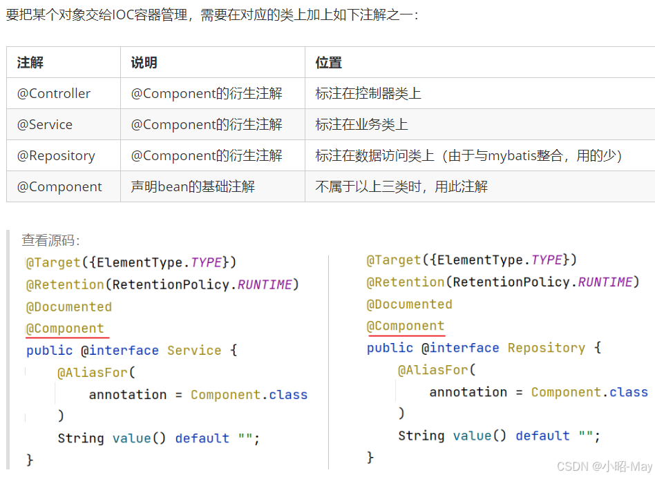 而Spring框架为了更好的标识web应用程序开发当中,bean对象到底归属于哪一层,又提供了@Component的衍生注解: