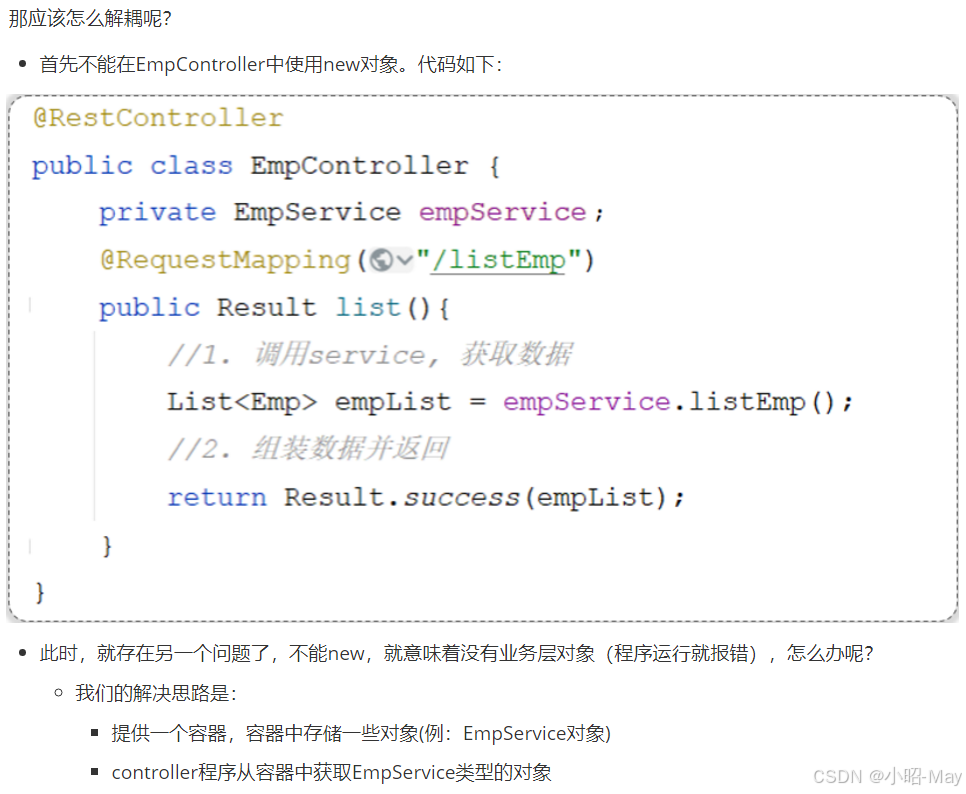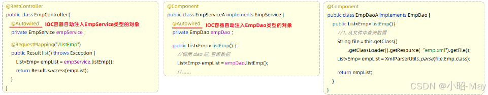 例:EmpController程序运行时需要EmpService对象,Spring容器就为其提供并注入EmpService对象