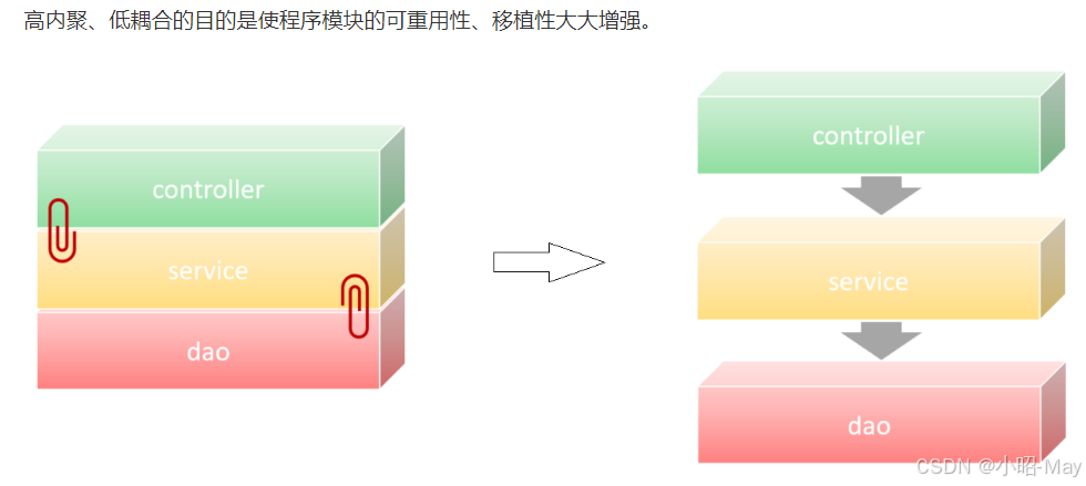 低耦合指的是:软件中各个层、模块之间的依赖关联程序越低越好。