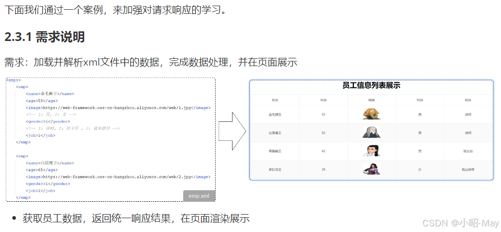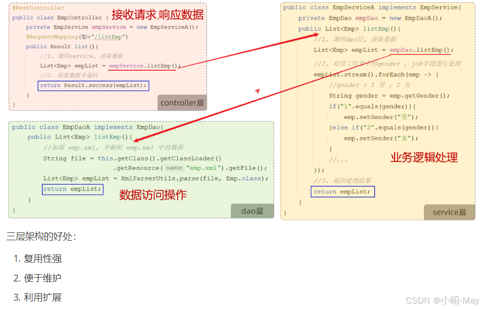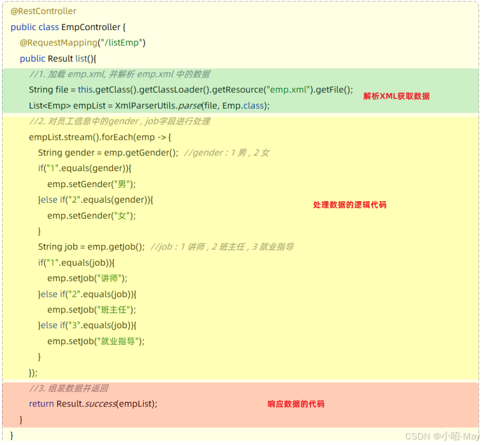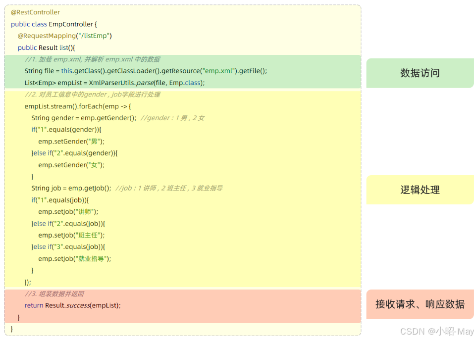 上述案例的功能,我们虽然已经实现,但是呢,我们会发现案例中:解析XML数据,获取数据的代码,处理数据的逻辑的代码,给页面响应的代码全部都堆积在一起了,全部都写在controller方法中了。
